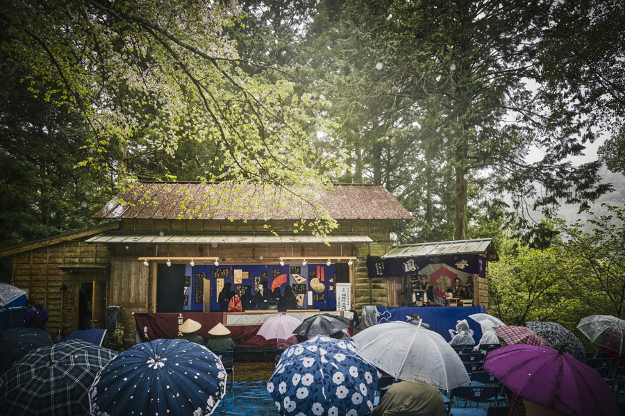 除了庆典活动,每年春天与秋天,农村舞台都有人形净琉璃表演。今年4月,丁晓文记录了一场伴随着春雨进行的表演,瓢泼大雨依然挡不住当地和从外地赶来的观众。人们打着伞、站在泥泞的地上看完了整场演出。