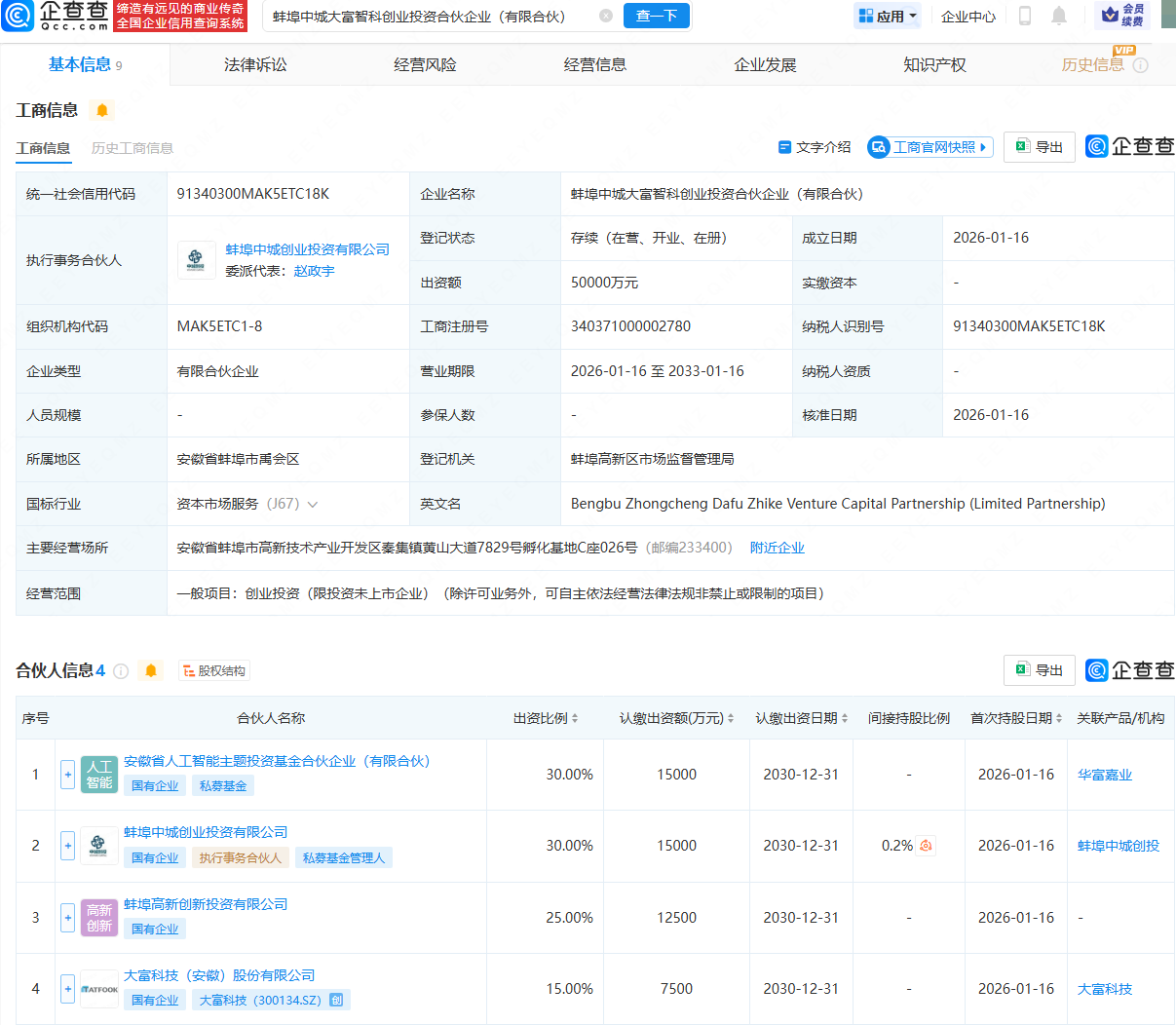 近日,蚌埠中城大富智科创业投资合伙企业(有限合伙)成立,出资额5亿元,经营范围包含:创业投资(限投资未上市企业)。企查查股权穿透显示,该合伙企业由安徽省人工智能主题投资基金合伙企业(有限合伙)、蚌埠中城创业投资有限公司、大富科技(300134)等共同持股。